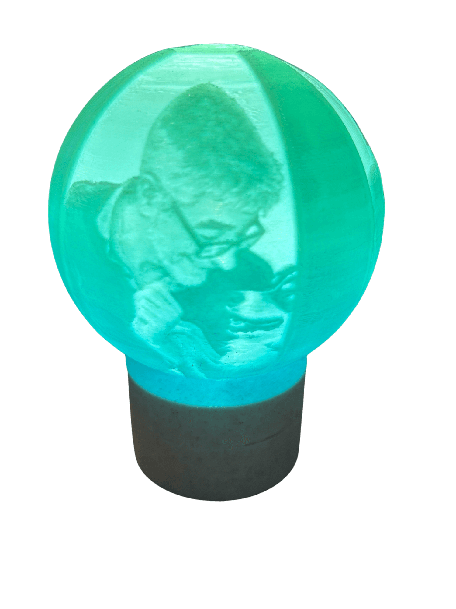 Cette boule lumineuse est réalisée en lithophanie, une technique qui transforme une photo en relief : la lumière révèle l’image avec douceur et précision.