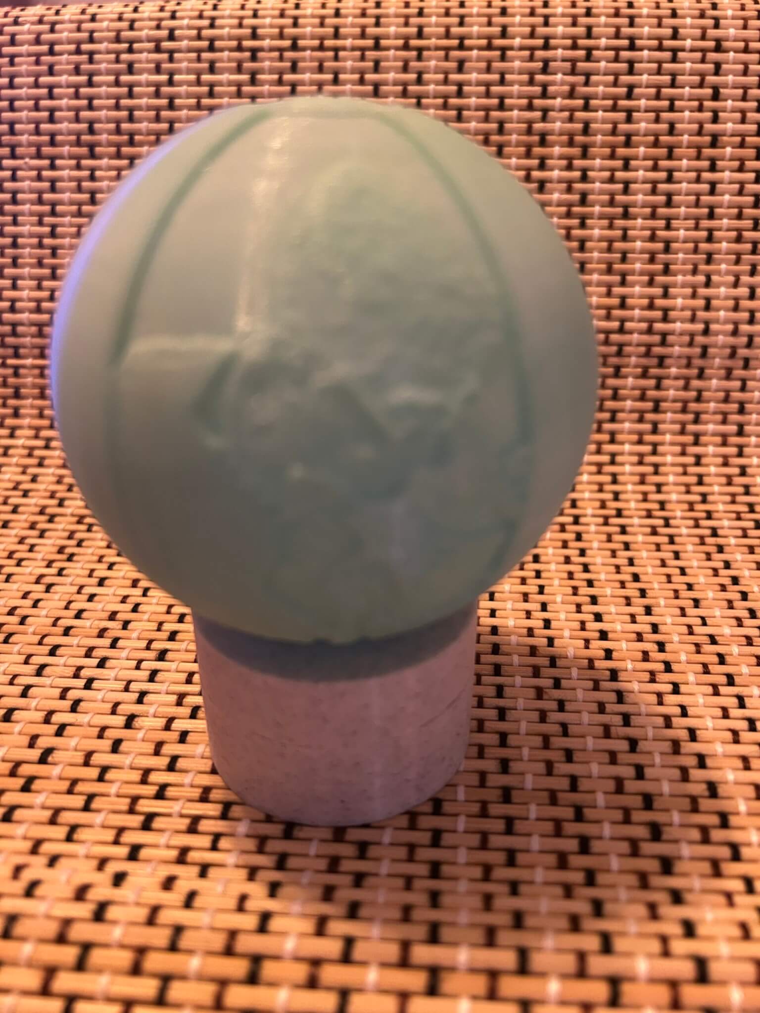 La boule est imprimée en 3D, tout comme son support. Le support permet de poser la boule et sert également d’interrupteur : il suffit de le tourner pour allumer ou éteindre la lumière.